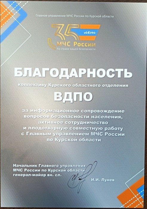 Благодарность коллективу Курского областного отделения ВДПО от ГУ МЧС России по Курской области