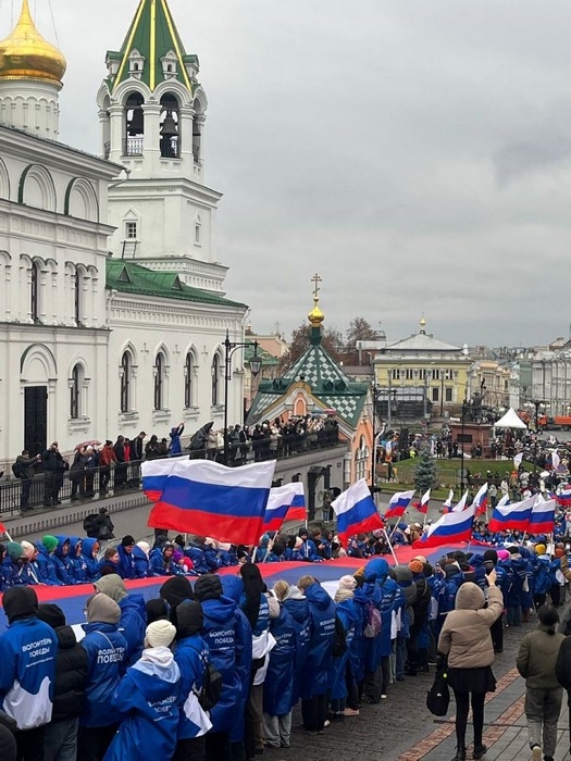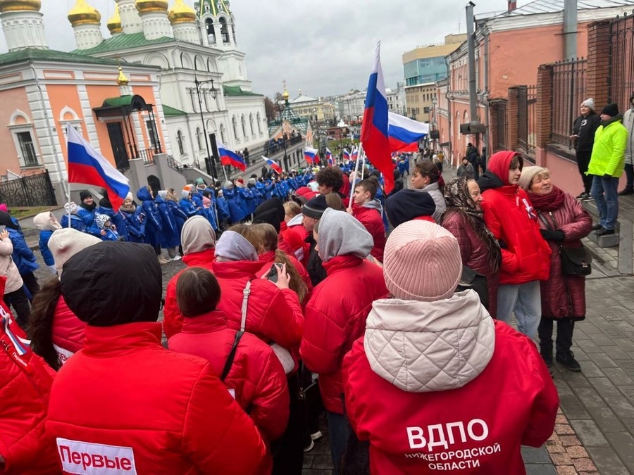 Представители общественных организаций, силовых структур, школьники и студенты прошли по знаковому историческому маршруту и на площади Народного единства и развернули 100-метровый флаг у стен Нижегородского Кремля.