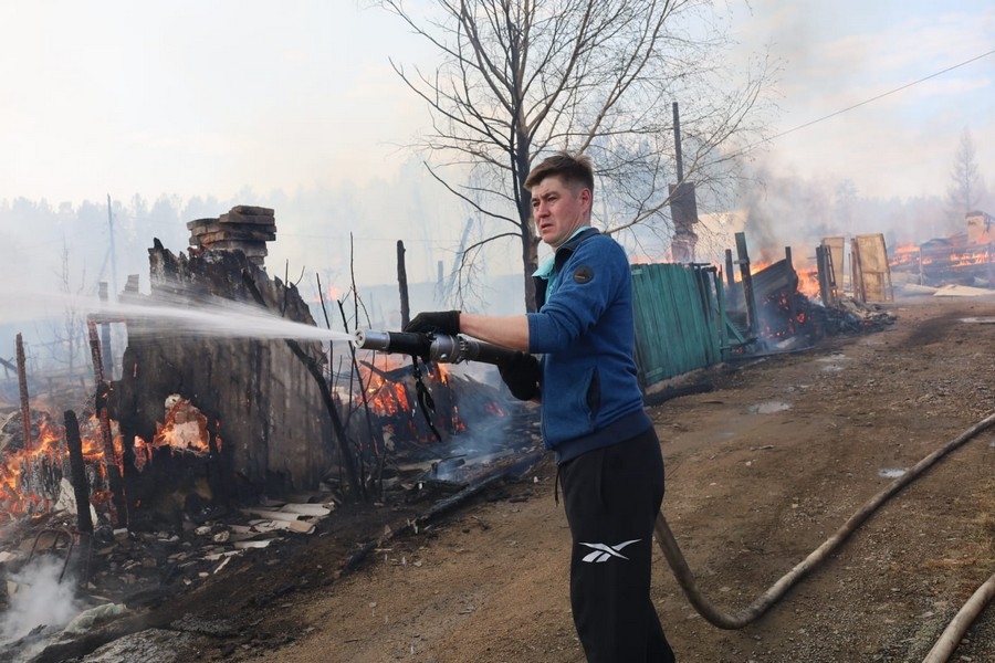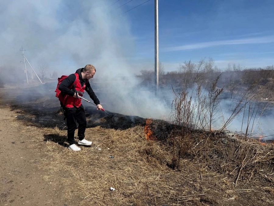 Добровольные пожарные вместе с представителями Забайкальского регионального отделения ВДПО тушат пожары в селе Смоленка