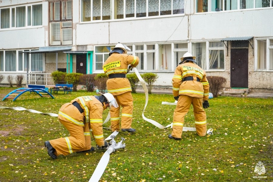 Далее добровольная пожарная команда продемонстрировала свою работу на показной тренировке. По легенде, в школе на втором этаже произошёл пожар. Для наглядности использовали дым-машину. Время прибытия к месту не превысило 6 минут. Добровольцы верно обнаружили очаг возгорания, эвакуировали пострадавшего и ликвидировали пожар.
