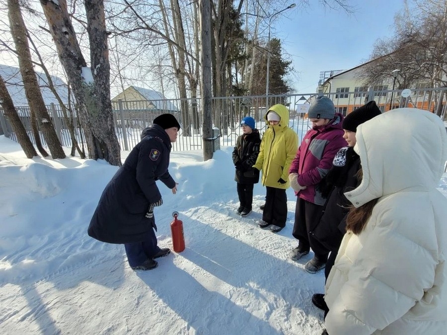 Занятие началось на школьном дворе, где ребята отрабатывали навыки обращения с первичными средствами пожаротушения.