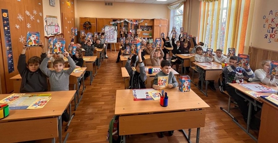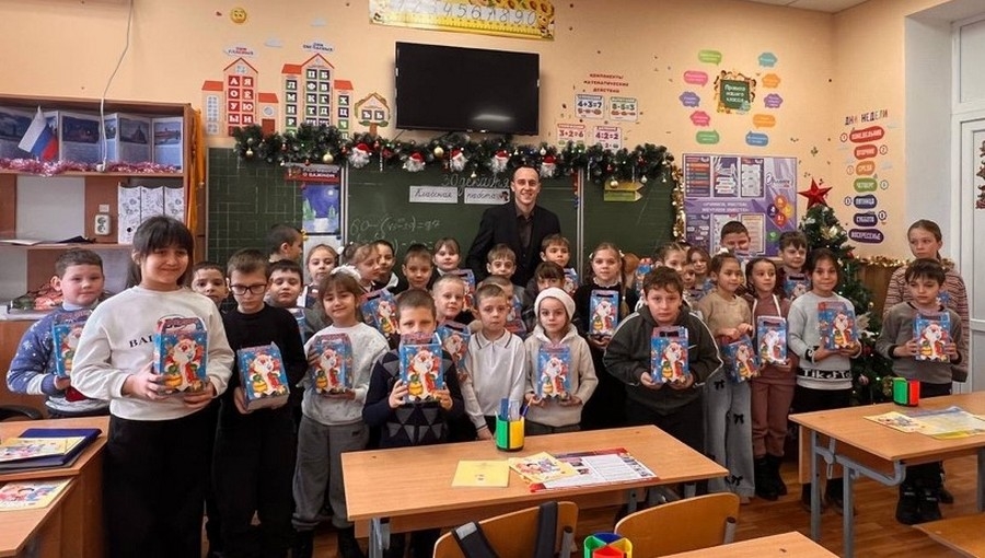 Алексей Пикуль поздравил школьников с Новым годом, вручил ребятам традиционные сладкие подарки, а также раскраски и памятки по пожарной безопасности от Всероссийского добровольного пожарного общества.