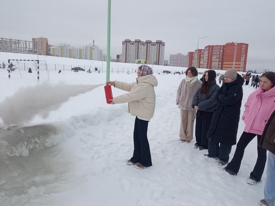 Поскольку в каждом учебном кабинете есть огнетушитель, волонтеры рассказали и показали принцип его работы и провели мастер-класс по применению порошкового огнетушителя при условном возгорании.